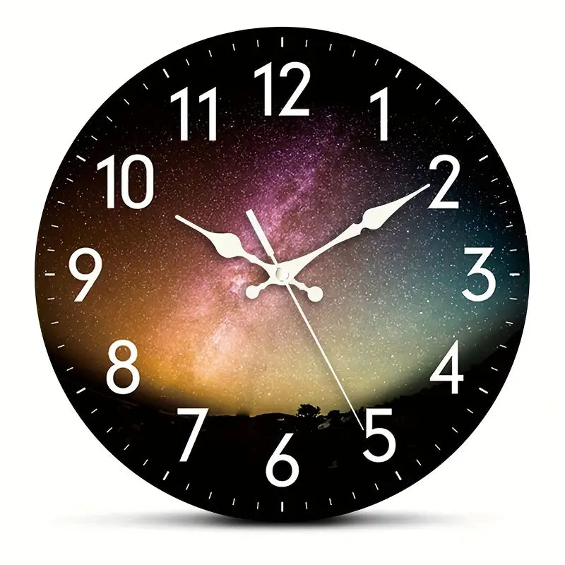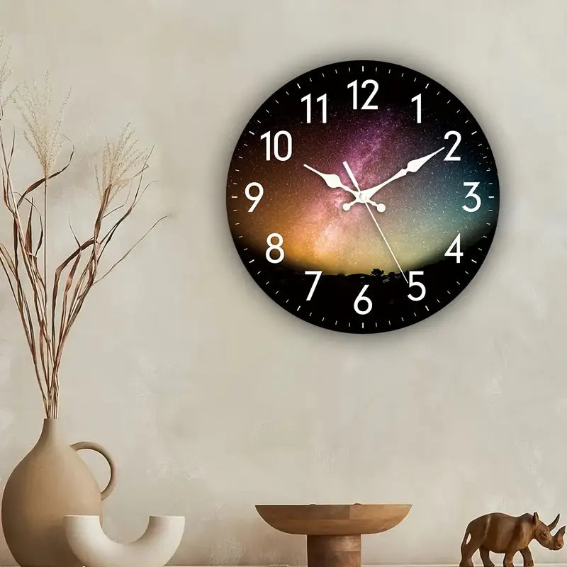 Breng de magie van het heelal naar je interieur met deze unieke houten klok. Met een diameter van 30 centimeter is het een perfecte eyecatcher voor elke ruimte. Het sterrenstelsel design combineert vloeiende overgangen van kleuren die doen denken aan verre melkwegstelsels en eindeloze sterrenhemels.